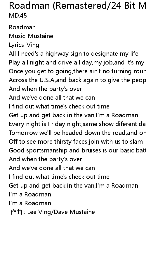 | [01:51] | Get up and get back in the van,I'm a Roadman |