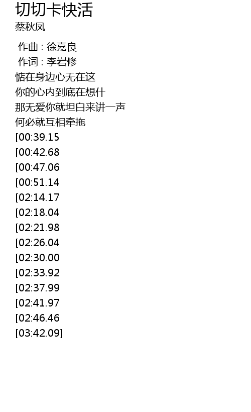 | [03:04.15][02:21.98][01:02.43] | 就当作唱一首歌 唱煞随人来行 |
