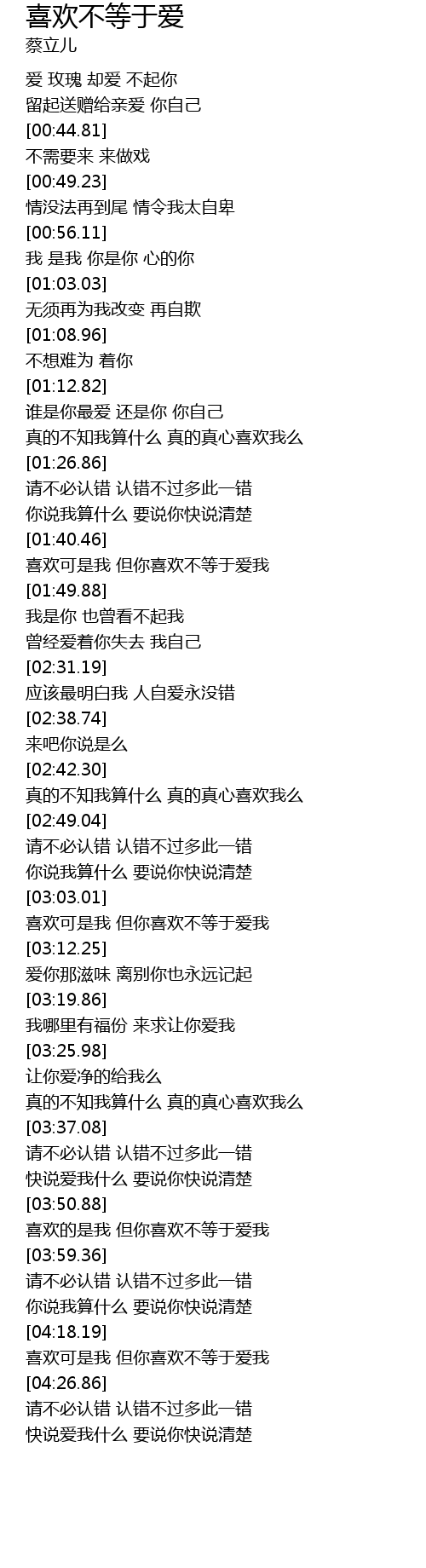 | [04:19.31] | 喜欢可是我 但你喜欢不等于爱我 |