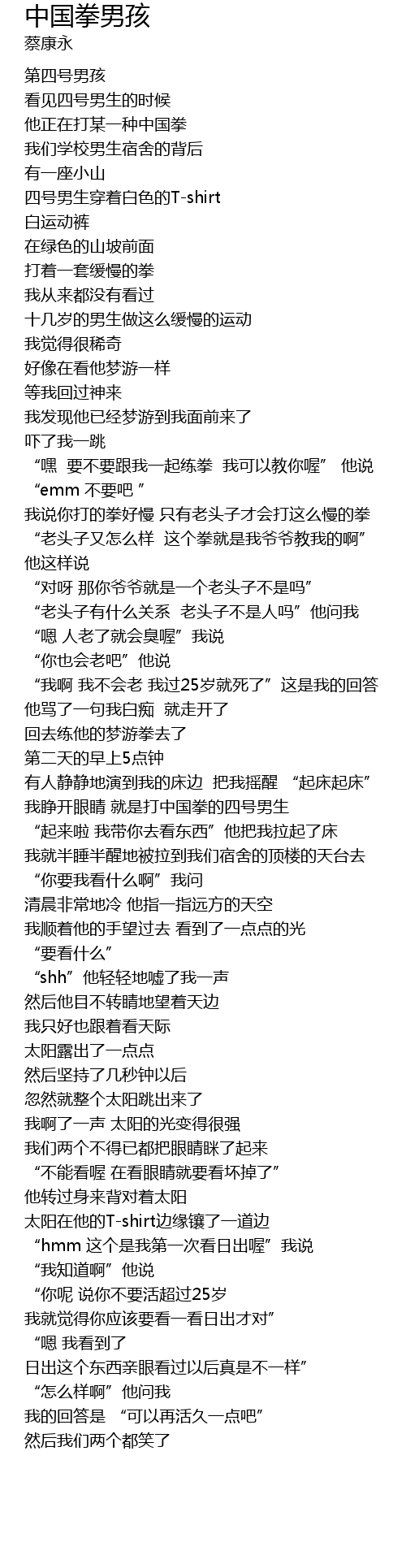| [00:37.22] | “嘿 要不要跟我一起练拳 我可以教你喔” 他说 |