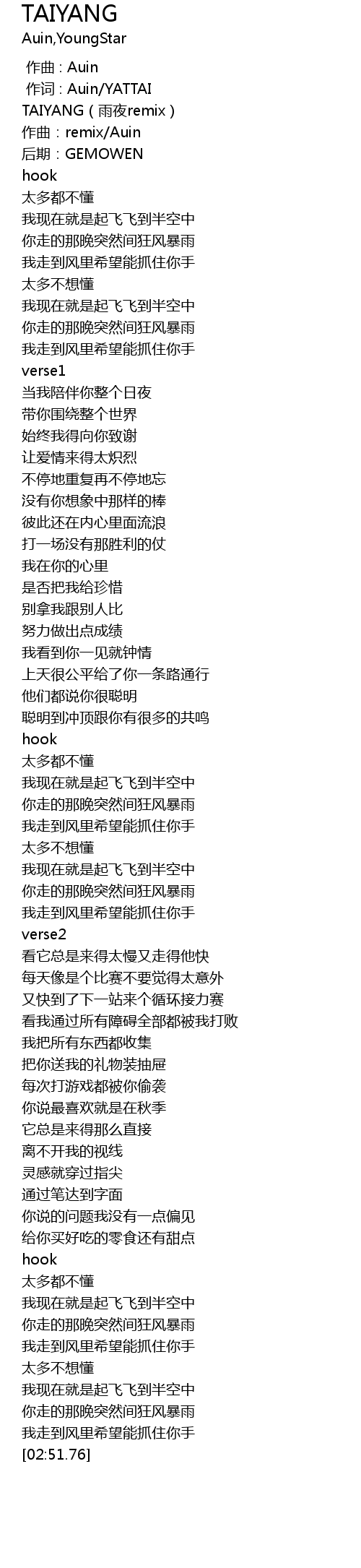 | [00:00.72] | TAIYANG yǔ yè remix |