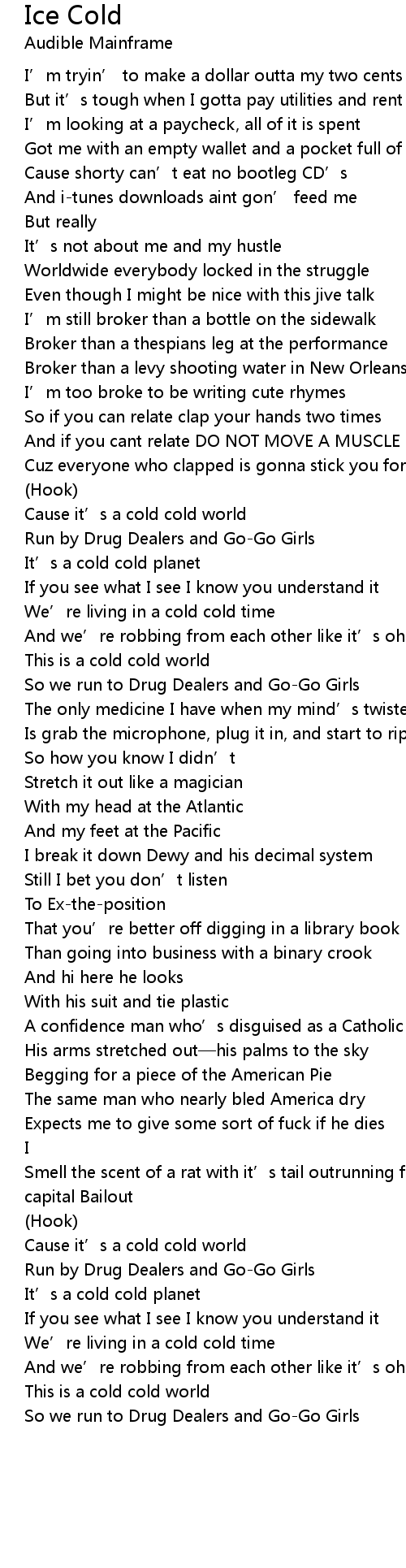 | Cause it' s a cold cold world | |