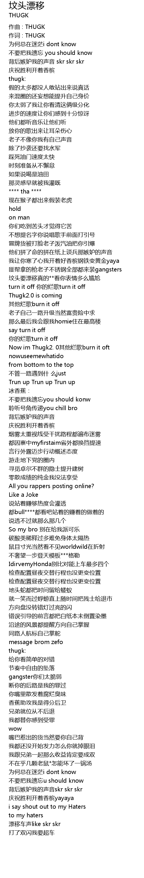 | Now im Thugk2. 0 qí tā làn gē burn it oft | |