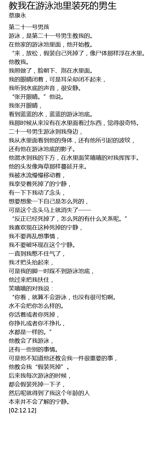 | [00:03.21] | 游泳,是第二十一号男生教我的。 |