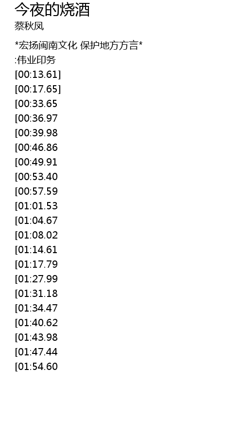 | [02:22.01][00:33.65] | 今夜的烧酒 |
