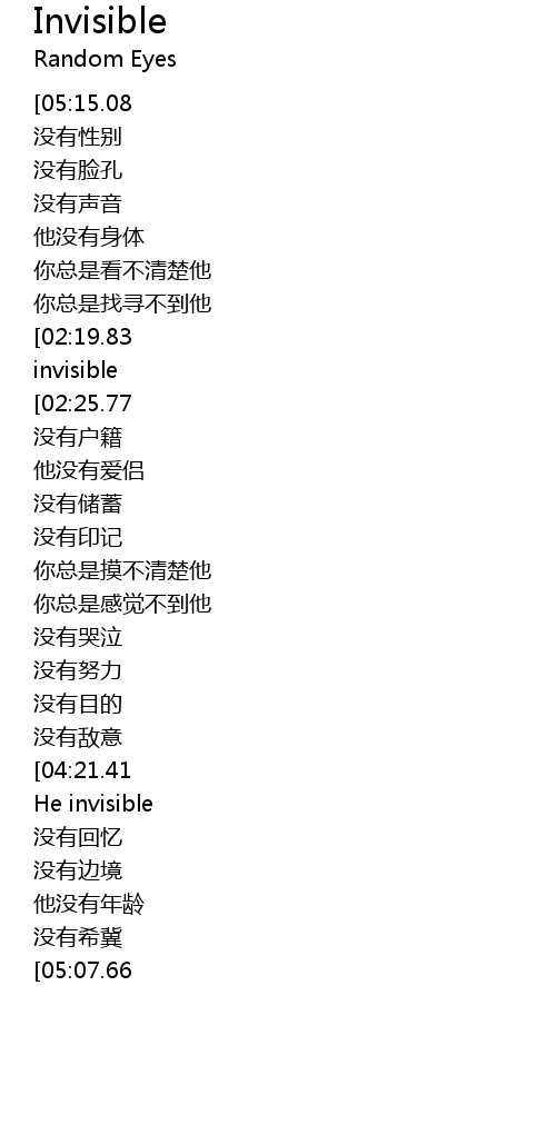 | [02:14.18][02:25.77][03:23.55][03:35.06] | he' s invisible |