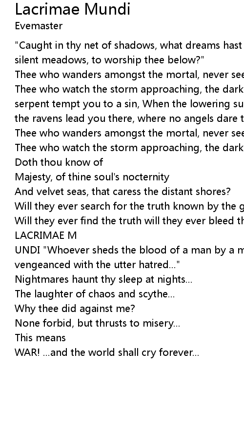 Thee who watch the storm approaching, the darkness calls thy name "Let the serpent tempt you to a sin, When the lowering sun dyes the crimson seas And let the ravens lead you there, where no angels dare to tread or dream (sleep)..." |