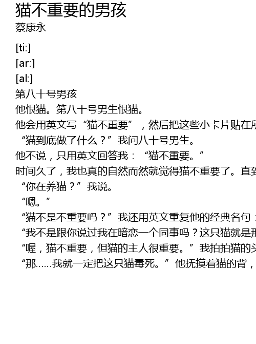 | [00:32.61] | 他不说,只用英文回答我:“猫不重要。” |