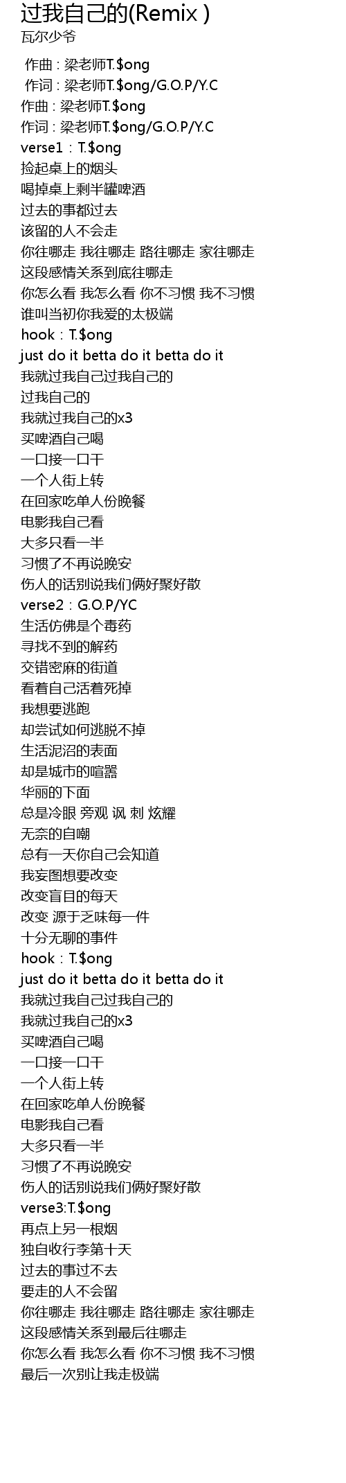 | [00:01.000] | 作词 : 梁老师T.$ong/G.O.P/Y.C |