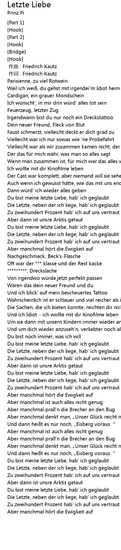 | [02:53.87] | Du bist meine letzte Liebe, hab' ich geglaubt |