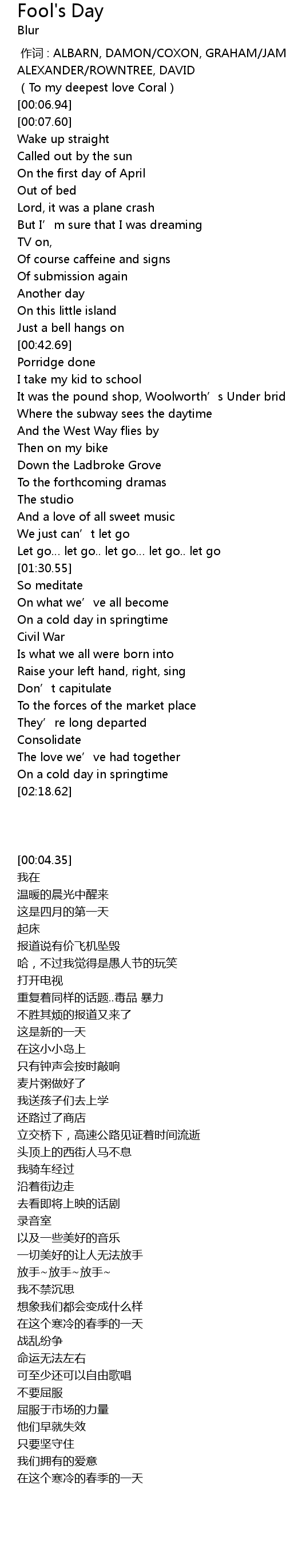 | [00:00.00] | 作词 : ALBARN, DAMON/COXON, GRAHAM/JAMES, STEVEN ALEXANDER/ROWNTREE, DAVID |
