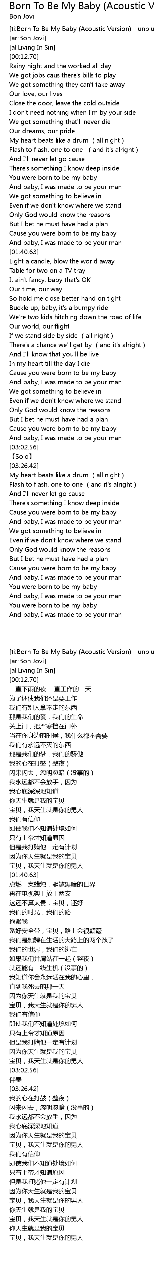 | [ti:Born To Be My Baby (Acoustic Version) - unplug] | |