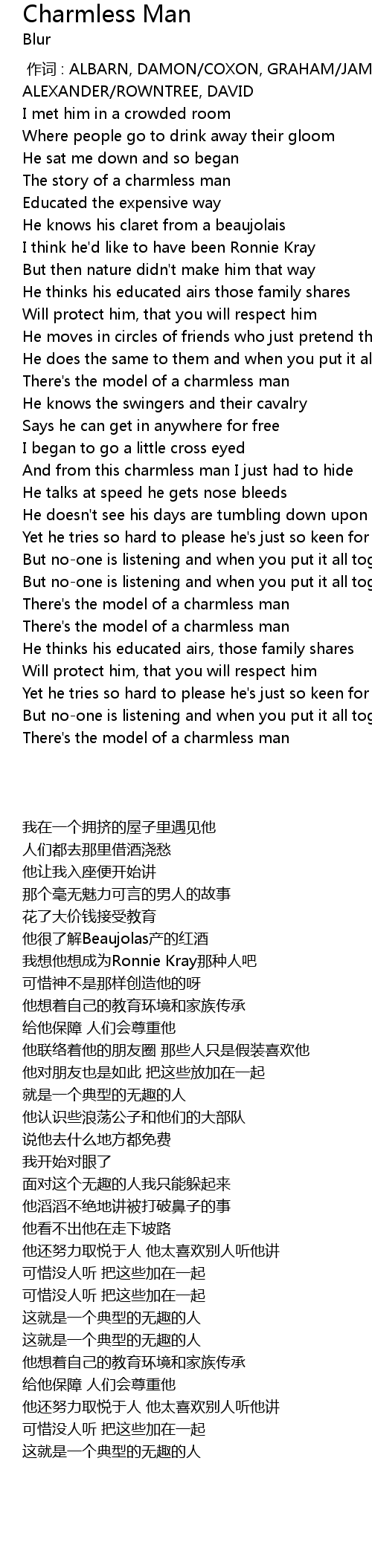 | [00:00.00] | zuò cí : ALBARN, DAMON COXON, GRAHAM JAMES, STEVEN ALEXANDER ROWNTREE, DAVID |