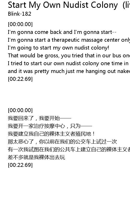 | [00:09.98] | I'm going to start my own nudist colony! |