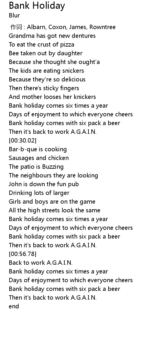 | [00:21.85] | Bank holiday comes with six pack a beer |