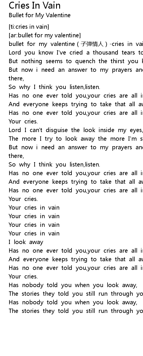 | [00:03.321] | bullet for my valentine zǐ dàn qíng rén cries in vain |
