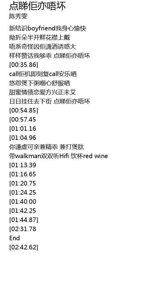 | [02:35.36][02:31.78][02:28.05][02:23.53] | 点睇佢亦唔坏 |