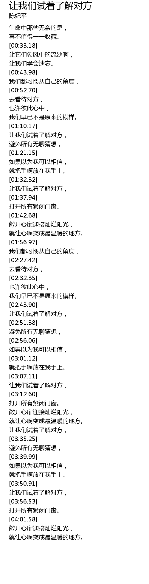 | [03:31.38] | ràng wǒ men shì zhe liǎo jiě duì fāng, |