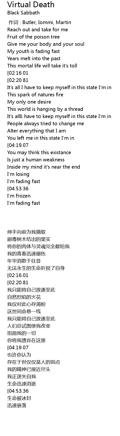 | [03:31.17][04:19.07][04:38.27][04:57.50] | Virtual death |