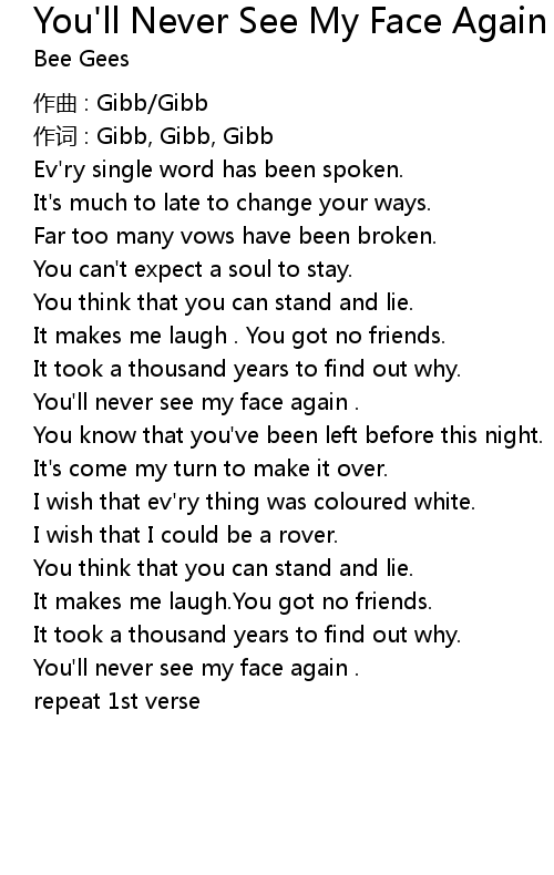 | Song | You'll Never See My Face Again |