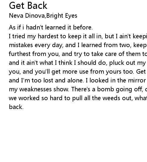 I tried my hardest to keep it all in, but I ain't keeping it in no more. Made mistakes every day, and I learned from two, keep those that you love, the furthest from you, and try to take care of them too. It's just a feeling I had, and it ain't what I think I should do, pluck out my heard and I'll give it to you, and you'll get more use from yours too. Get back, I'm too tired to go home and I'm too lost and alone. I looked in the mirror on the back of your door, all my weaknesses show. There's a bomb going off, out in the yard of the house, when we worked so hard to pull all the weeds out, what were we talking about. Get back.