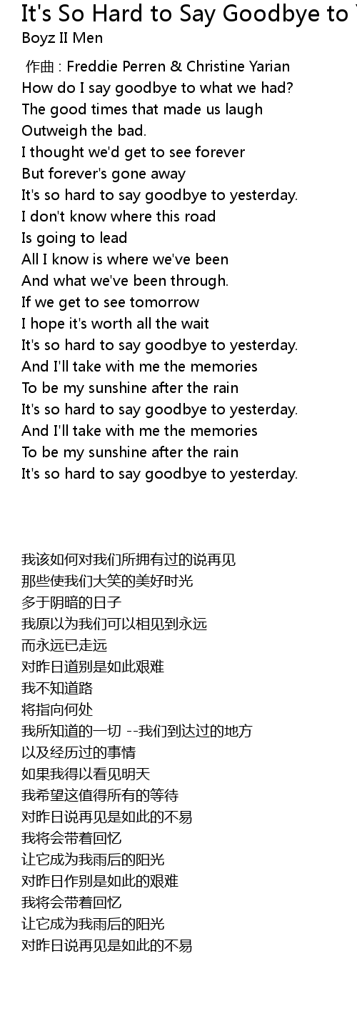 | [00:41.630] | It' s so hard to say goodbye to yesterday. |