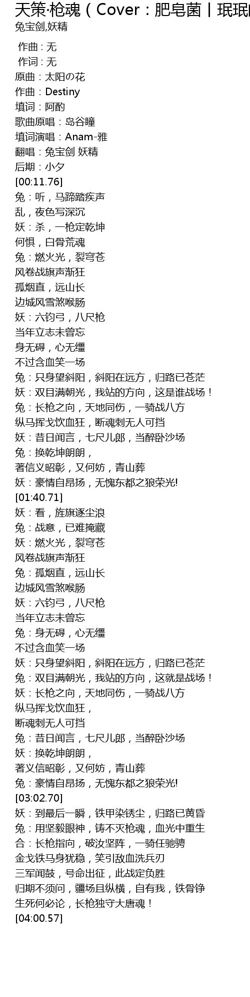 | [02:28.98] | yāo: cháng qiāng zhī xiàng, tiān dì tóng shāng, yī qí zhàn bā fāng |