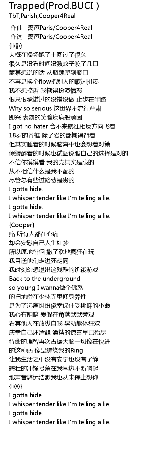 | [00:01.000] | 作词 : 篱笆Paris/Cooper4Real |