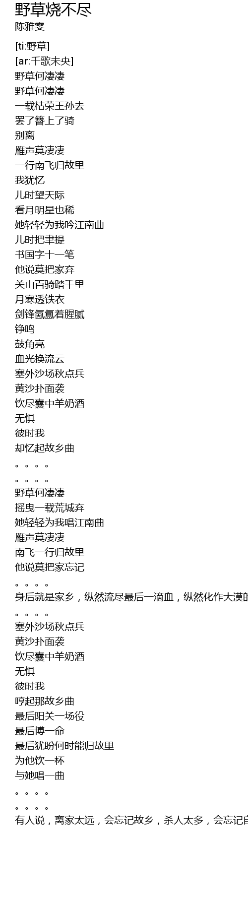 | [04:42.849] | yǒu rén shuō, lí jiā tài yuǎn, huì wàng jì gù xiāng, shā rén tài duō, huì wàng jì zì jǐ. zài zhàn chǎng shàng sǐ qù, shēng mìng xiàng yǔ shuǐ luò rù dà dì, háo wú hén jī. |