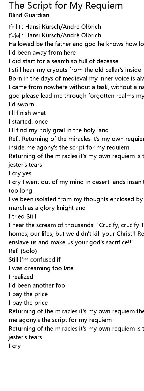 | Returning of the miracles it' s my own requiem the jester' s tears they are inside me agony' s the script for my requiem | |