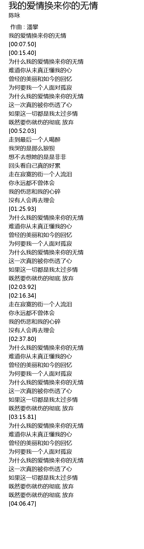 | [00:17.05] | wèi shí me wǒ de ài qíng huàn lái nǐ de wú qíng |