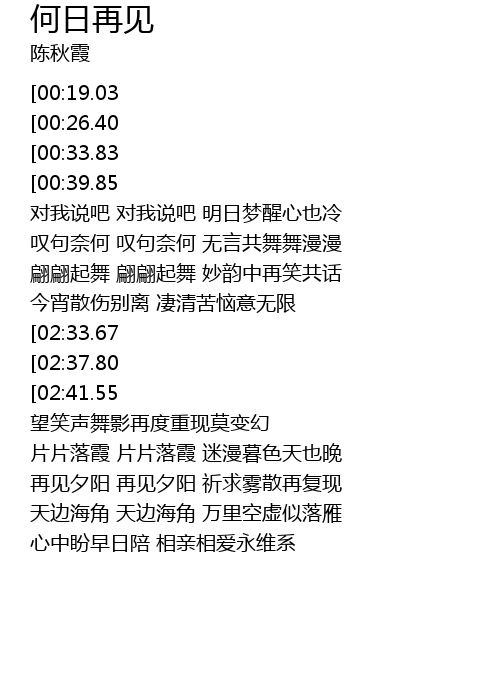 | [02:52.59][02:37.80][01:21.94] | hé rì jiàn hé rì jiàn fēn fēi yàn miào màn |