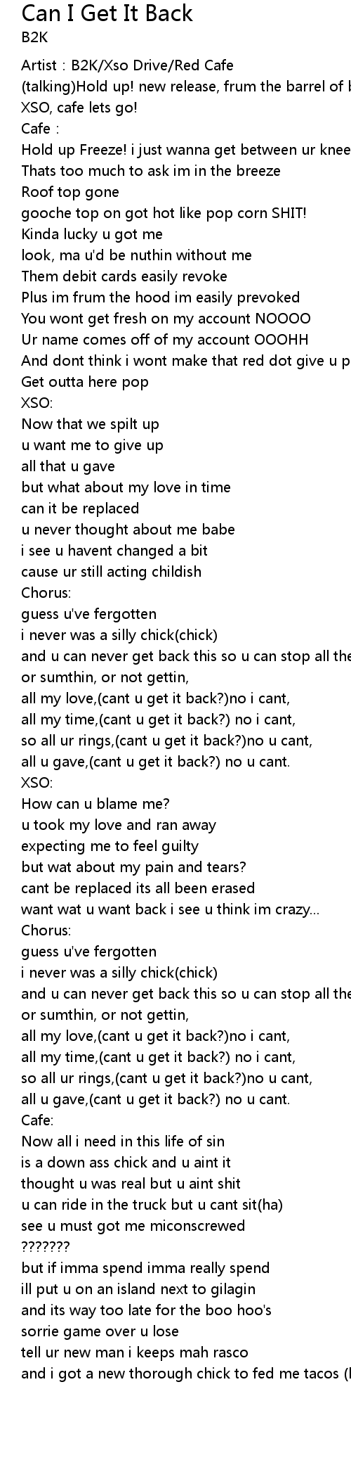 | and u can never get back this so u can stop all the callin, complainin, stressin or sumthin, or not gettin, | |