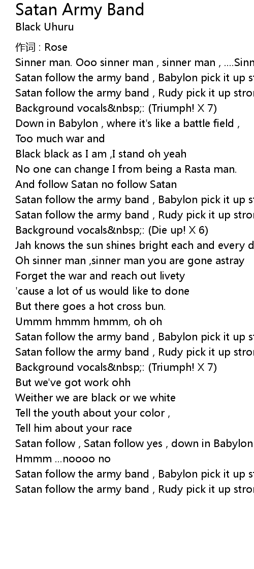 | Satan follow the army band , Babylon pick it up strong strong strong. | |