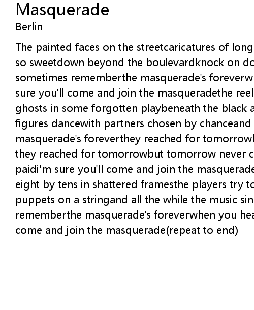 The painted faces on the streetcaricatures of long agooh they were young and oh so sweetdown beyond the boulevardknock on doors and empty hallsand still sometimes rememberthe masquerade's foreverwhen you see the price they paidi'm sure you'll come and join the masqueradethe reeling figures pass on bylike ghosts in some forgotten playbeneath the black and empty skymusic plays and figures dancewith partners chosen by chanceand still some times rememberthe masquerade's foreverthey reached for tomorrowbut tomorrow's more of the sameso they reached for tomorrowbut tomorrow never camewhen you hear the price they paidi'm sure you'll come and join the masqueradeone by one and two by twopast eight by tens in shattered framesthe players try to leave the roomfrantic puppets on a stringand all the while the music singsand still sometimes rememberthe masquerade's foreverwhen you hear the price they paidi'm sure you'll come and join the masquerade(repeat to end) |