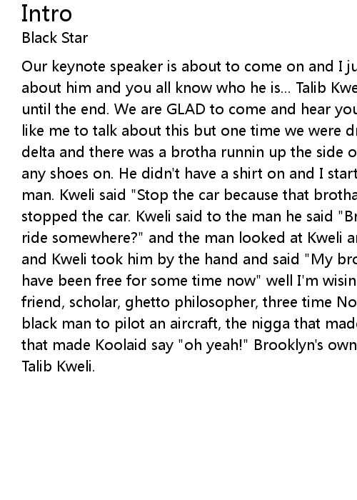 Our keynote speaker is about to come on and I just wanted to say a few words about him and you all know who he is... Talib Kweli! Please, hold your applause until the end. We are GLAD to come and hear you speak. We love it! Kweli doesn't like me to talk about this but one time we were driving through the Mississippi delta and there was a brotha runnin up the side of the road and he didn't have any shoes on. He didn't have a shirt on and I started to drive right by this man. Kweli said "Stop the car because that brotha might be in trouble" and I stopped the car. Kweli said to the man he said "Brotha are you ok do you need a ride somewhere?" and the man looked at Kweli and said "Shhhhhh... I'm escapin!" and Kweli took him by the hand and said "My brotha you didn't get the memo, we have been free for some time now" well I'm wisinen up. Please welcome good friend, scholar, ghetto philosopher, three time Nobel peace prize winner, first black man to pilot an aircraft, the nigga that made up the Nike swoosh, the man that made Koolaid say "oh yeah!" Brooklyn's own...