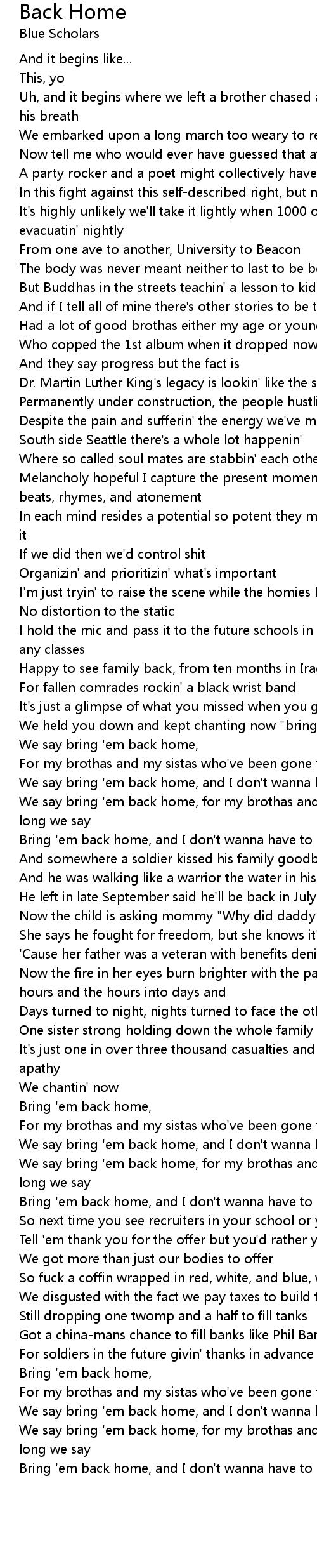 We say bring 'em back home, for my brothas and my sistas who've been gone too long we say |