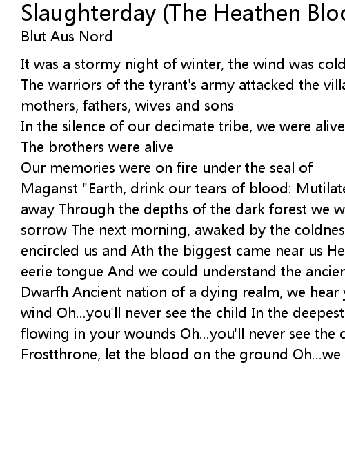 Maganst "Earth, drink our tears of blood: Mutilated corpses in our head, we ran away Through the depths of the dark forest we wandered, and fell in a dream of sorrow The next morning, awaked by the coldness of the dawn Some ravens encircled us and Ath the biggest came near us He talked to our soul in a very eerie tongue And we could understand the ancient words of the messenger of Dwarfh Ancient nation of a dying realm, we hear your song, she's flying in the wind Oh...you'll never see the child In the deepest sorrow, your tears are flowing in your wounds Oh...you'll never see the child Dead in the realm of Frostthrone, let the blood on the ground Oh...we are the children. |