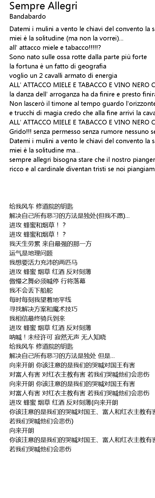 | sempre allegri bisogna stare che il nostro piangere fa male al re fa male al ricco e al cardinale diventan tristi se noi piangiam |