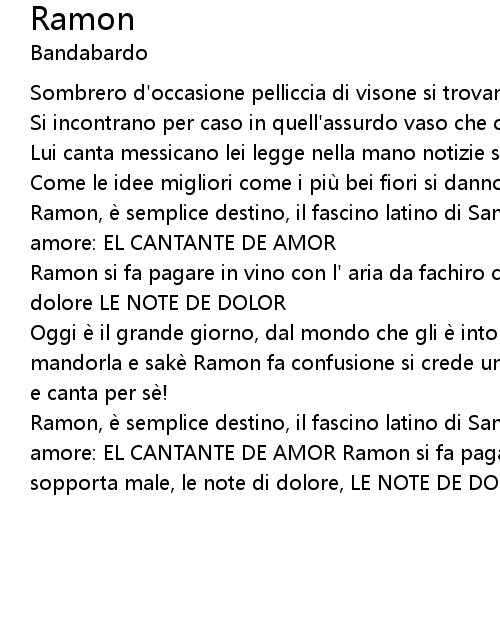 | Oggi è il grande giorno, dal mondo che gli è intorno sbucano due occhi di mandorla e sakè Ramon fa confusione si crede una canzone si sbaglia, si incanta e canta per sè! | |
