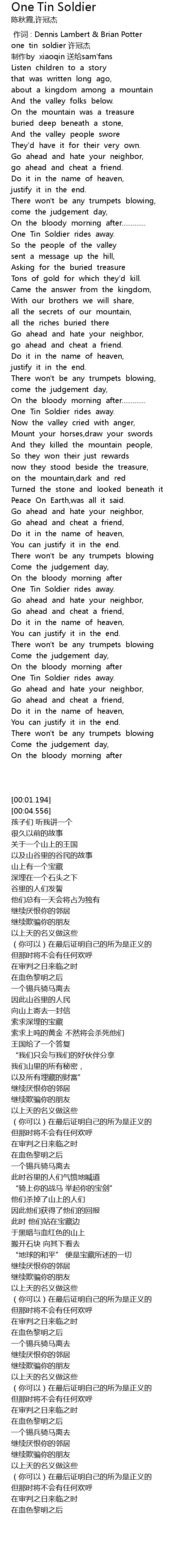 | [00:01.194] | one tin soldier xǔ guān jié |
