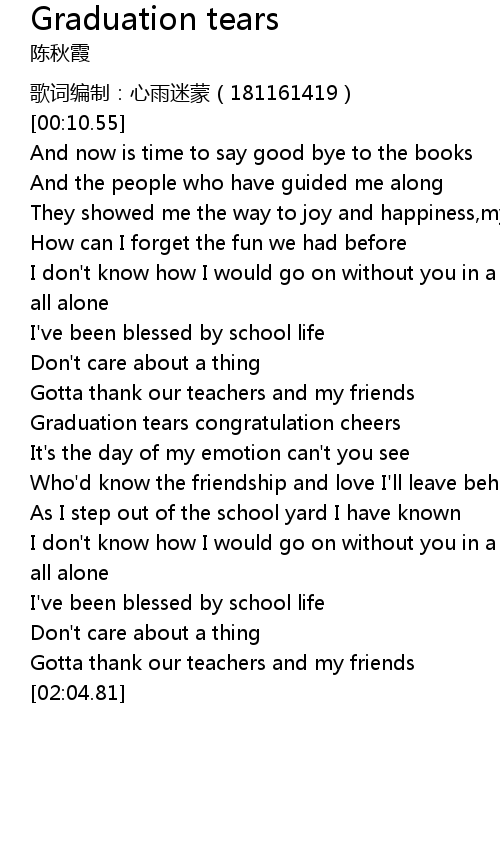 | [01:05.78] | Graduation tears congratulation cheers |