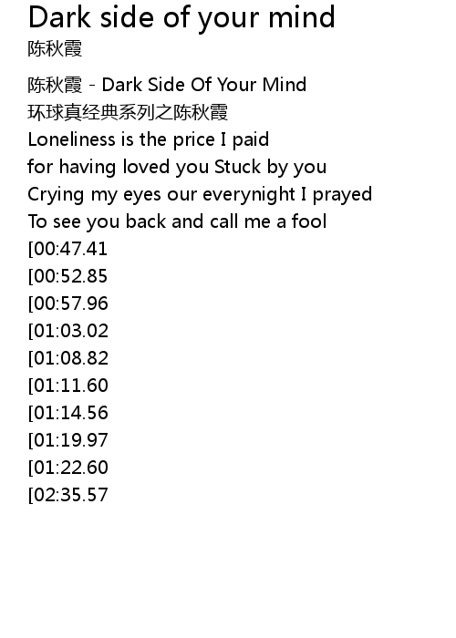 | [00:00.00] | 陈秋霞 - Dark Side Of Your Mind |