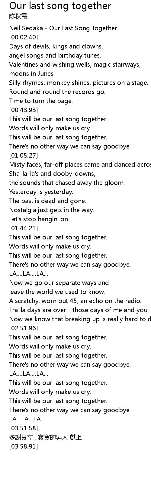 | [00:01.03] | Neil Sedaka - Our Last Song Together |