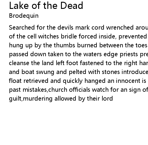 Searched for the devils mark cord wrenched around the head chained to the wall of the cell witches bridle forced inside, prevented from rest a bodkin inserted hung up by the thumbs burned between the toes asked of conspirators judgement passed down taken to the waters edge priests prepare a lost soul on a quest to cleanse the land left foot fastened to the right hand strung between the shore and boat swung and pelted with stones introduced to the lake a guilty witch to float retrieved and quickly hanged an innocent is sure to sink and cleared of past mistakes,church officials watch for an sign of pain to prove guilt,murdering allowed by their lord |