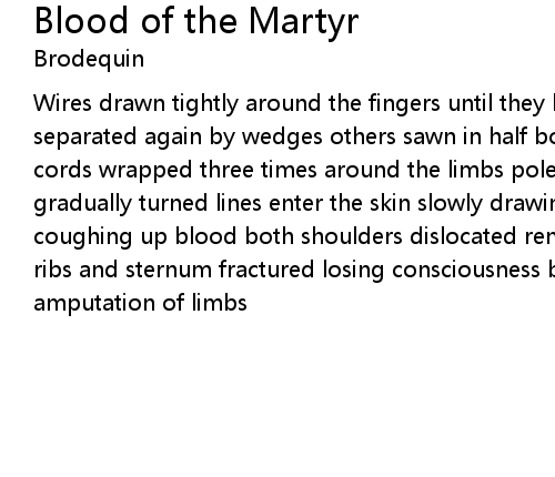 | Wires drawn tightly around the fingers until they become one solid mass separated again by wedges others sawn in half bound to the framework with thin cords wrapped three times around the limbs poles inserted between the boards gradually turned lines enter the skin slowly drawing the arms together while coughing up blood both shoulders dislocated removed while the bones are reset ribs and sternum fractured losing consciousness bleeding profusely from the amputation of limbs |