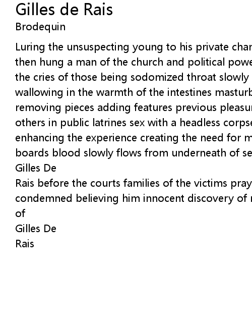 Luring the unsuspecting young to his private chambers quickly seized stripped then hung a man of the church and political power reassuring no harm to silence the cries of those being sodomized throat slowly cut braguemard severs the head wallowing in the warmth of the intestines masturbating upon entrails of the dead removing pieces adding features previous pleasures litter the floor disposing of others in public latrines sex with a headless corpse the violet convulsions enhancing the experience creating the need for more bodies hidden under floor boards blood slowly flows from underneath of secret hidden doors |