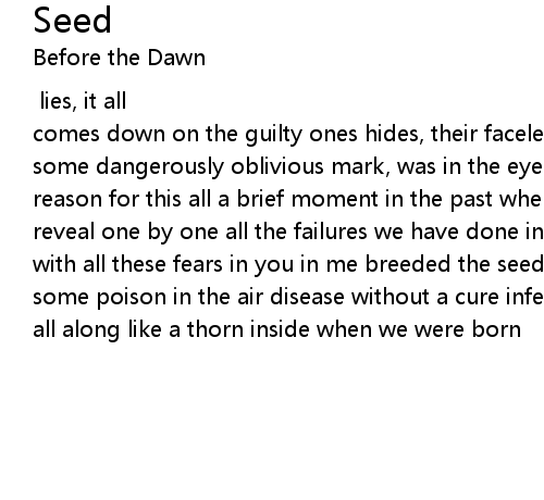 [music: Tuomas Saukkonen, words:Tuomas Saukkonen/Panu Willman] lies, it all comes down on the guilty ones hides, their faceless looks it has begun dark, some dangerously oblivious mark, was in the eyes that grave to crush was there a reason for this all a brief moment in the past when all went wrong a memory to reveal one by one all the failures we have done in you in me breeded the seed with all these fears in you in me breeded the seed behind these tears was there some poison in the air disease without a cure infected as we inhale or was it all along like a thorn inside when we were born |