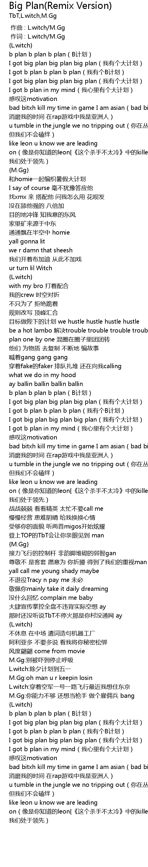 | [01:17.287] | I got big plan big plan big plan wo you ge da ji hua |