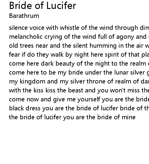 | silence voice with whistle of the wind through dim nocturnal, misty air melancholic crying of the wind full of agony and despair those graves with those old trees near and the silent humming in the air weak mortals stiffen by the fear if do they walk by night here spirit of that place is filled with fright come here dark beauty of the night to the realm of the night out from the light come here to be my bride under the lunar silver glow come to me and let me show my kingdom and my silver throne of realm of darkness of my own seal this part with the kiss kiss the beast and you won't miss the world of mortal and the weak come now and give me yourself you are the bride of lucifer my mistress in thin black dress you are the bride of lucifer bride of the prince of darkness you are the bride of lucifer you are the bride of mine |